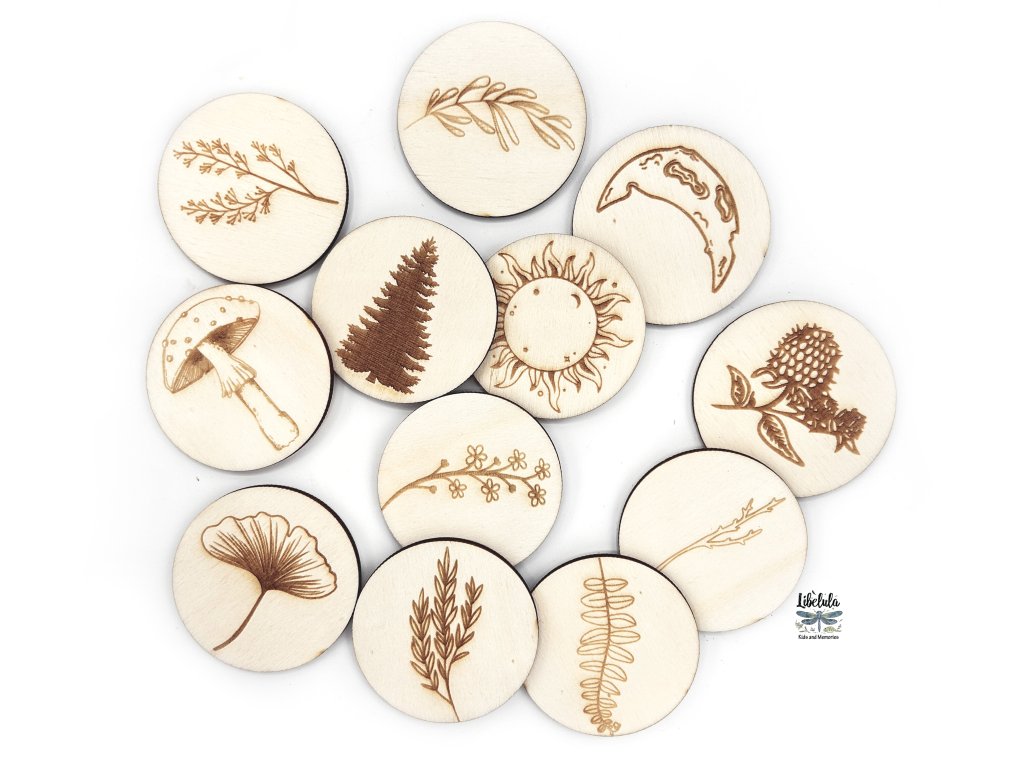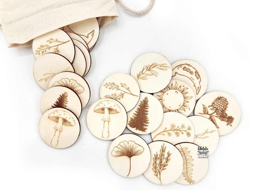 🌲🍄 Nechajte deti dotknúť sa lesa hrou! Drevené pexeso Dotyky lesa prináša 12 párov rastlín, listov, húb a nebeských symbolov, ktoré rozvíjajú pamäť, jemnú motoriku aj lásku k prírode. Gravírované kartičky z 4 mm preglejky sú pevné, ekologické a vo vrecúšku z bavlny pripravené na všetky výlety, škôlkarske dni aj pokojné večery doma. 🍃🌙
