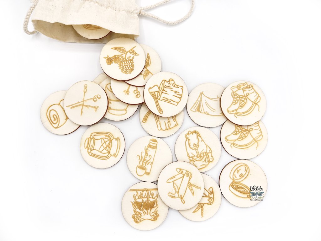 Drevené pexeso Skauting predstavuje motívy z prírody a táborníckeho života – stany, stopy, ohník, batoh aj lesné zvieratá.
