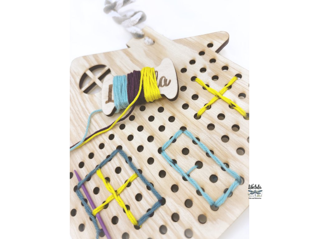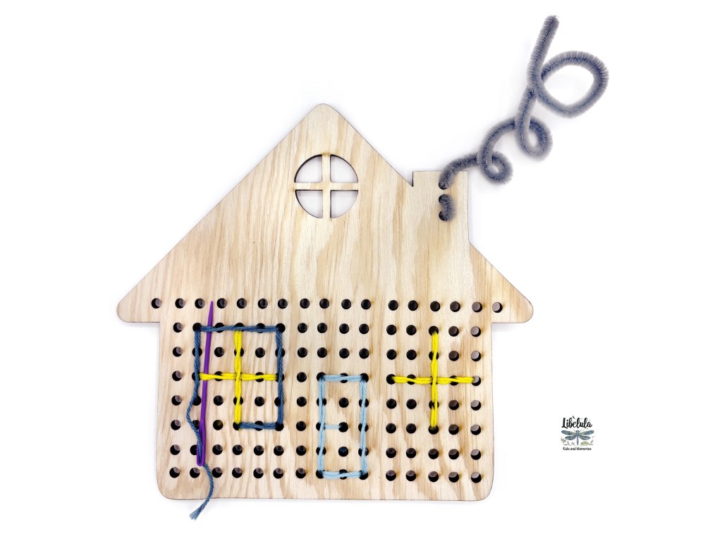 Ide o drevený tvar s menšími otvormi a súpravou na šnurovanie ako u veľkých – bavlnená niť a bezpečná montessori ihla sú súčasťou balenia. Deti sa tak naučia presnejšie manipulovať, sústrediť a dokončiť kreatívny úlohu až do konca.