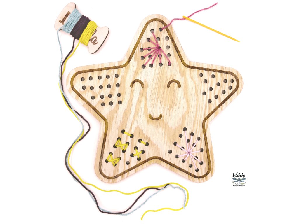 Ide o drevený tvar s menšími otvormi a súpravou na šnurovanie ako u veľkých – bavlnená niť a bezpečná montessori ihla sú súčasťou balenia. Deti sa tak naučia presnejšie manipulovať, sústrediť a dokončiť kreatívny úlohu až do konca.