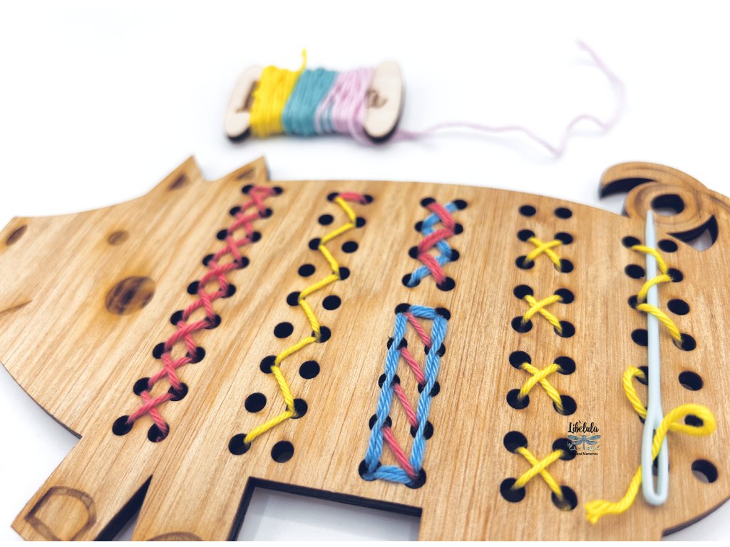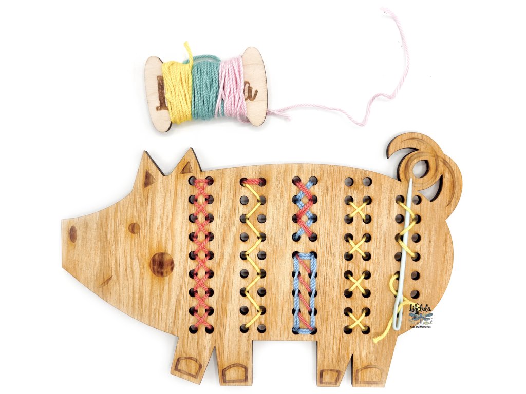 Ide o drevený tvar s menšími otvormi a súpravou na šnurovanie ako u veľkých – bavlnená niť a bezpečná montessori ihla sú súčasťou balenia. Deti sa tak naučia presnejšie manipulovať, sústrediť a dokončiť kreatívny úlohu až do konca.