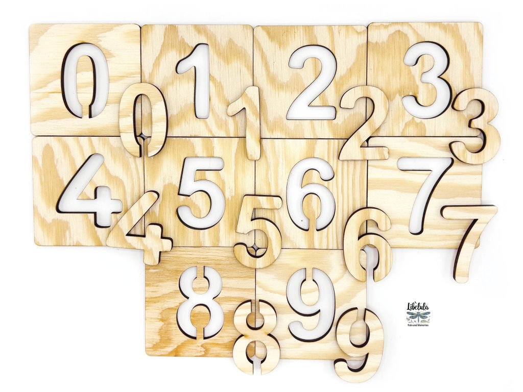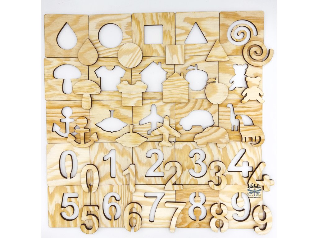 Drevené vzdelávacie puzzle – MIX tvarov, objektov a čísiel (50 ks – náhodný výber)