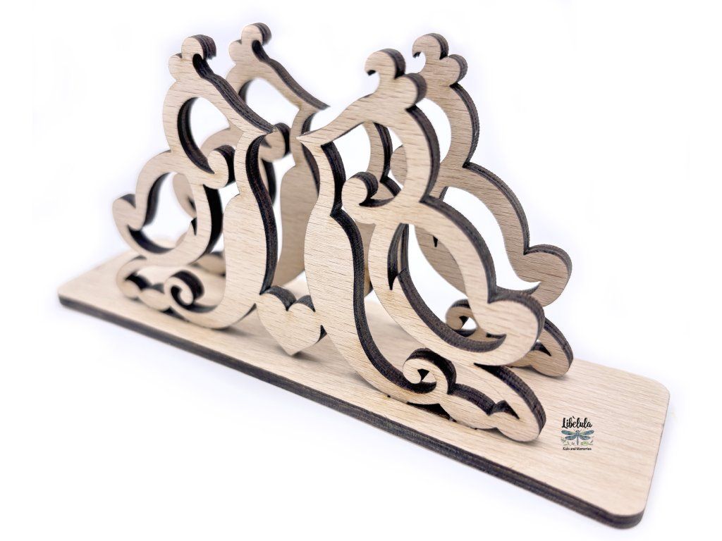 Drevený stojan na servítky s jemným motívom, ktorý oživí každé prestieranie. Elegantný doplnok pre svadobný stôl, oslavu alebo romantickú večeru.