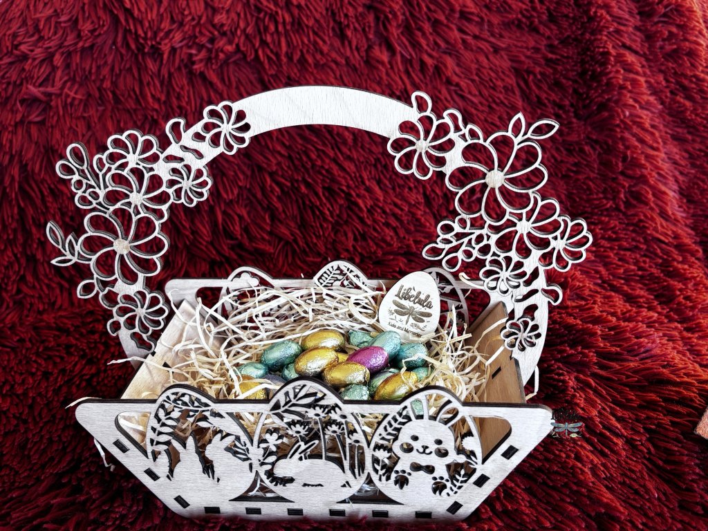 Elegantný veľkonočný košík z kvalitnej dubovej preglejky s jemne vyrezávaným kvetinovým uškom a motívmi prírody po stranách. Stabilná konštrukcia a detailné spracovanie z neho robia krásny dekoračný aj darčekový prvok.