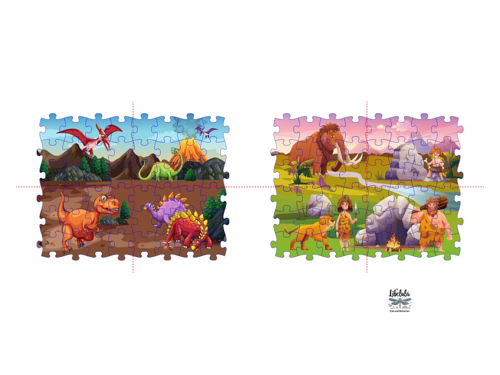 🧩 Obsahuje: 12 obojstranných dielikov, ktoré do seba jednoducho zapadajú. Na jednej strane objavíte svet dinosaurov – T-Rex, Brontosaurus, Pterodaktyl, Stegosaurus. Otočte puzzle a cestujte do praveku s mamutom, šabľozubým tigrom a pračlovekmi!