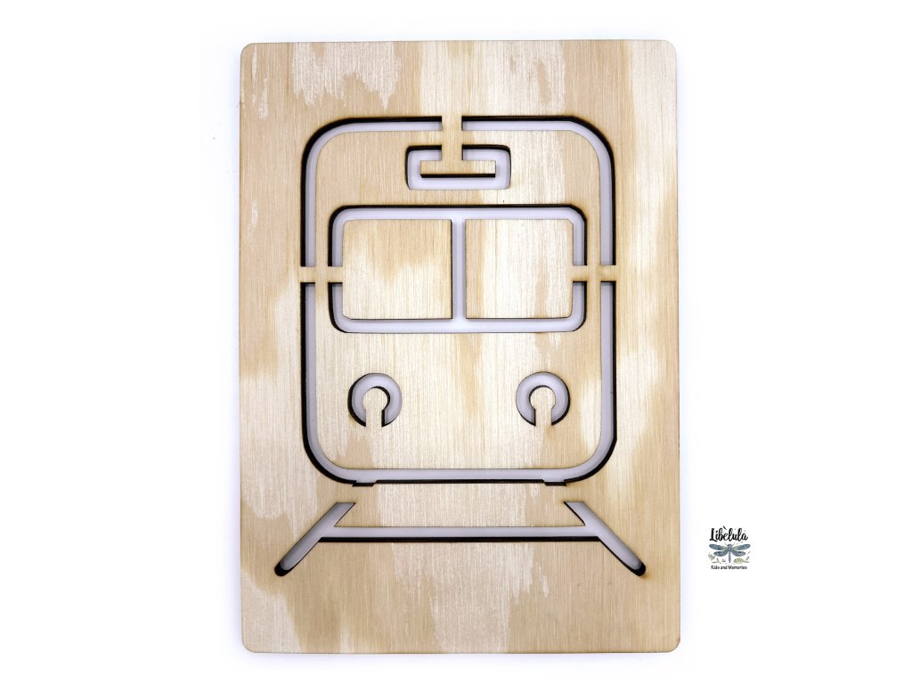 Tichý jazdec mestskými koľajami! 🚋 Drevená šablóna v tvare električky je ideálna na obťahovanie ceruzkou alebo štetcom.