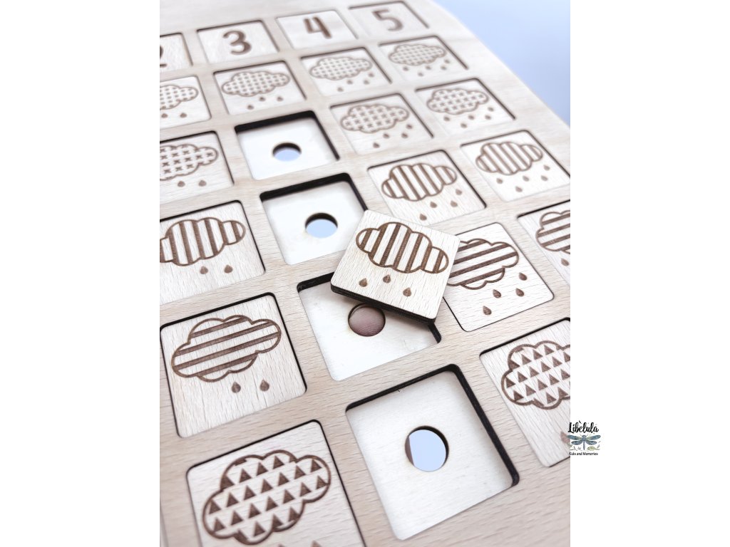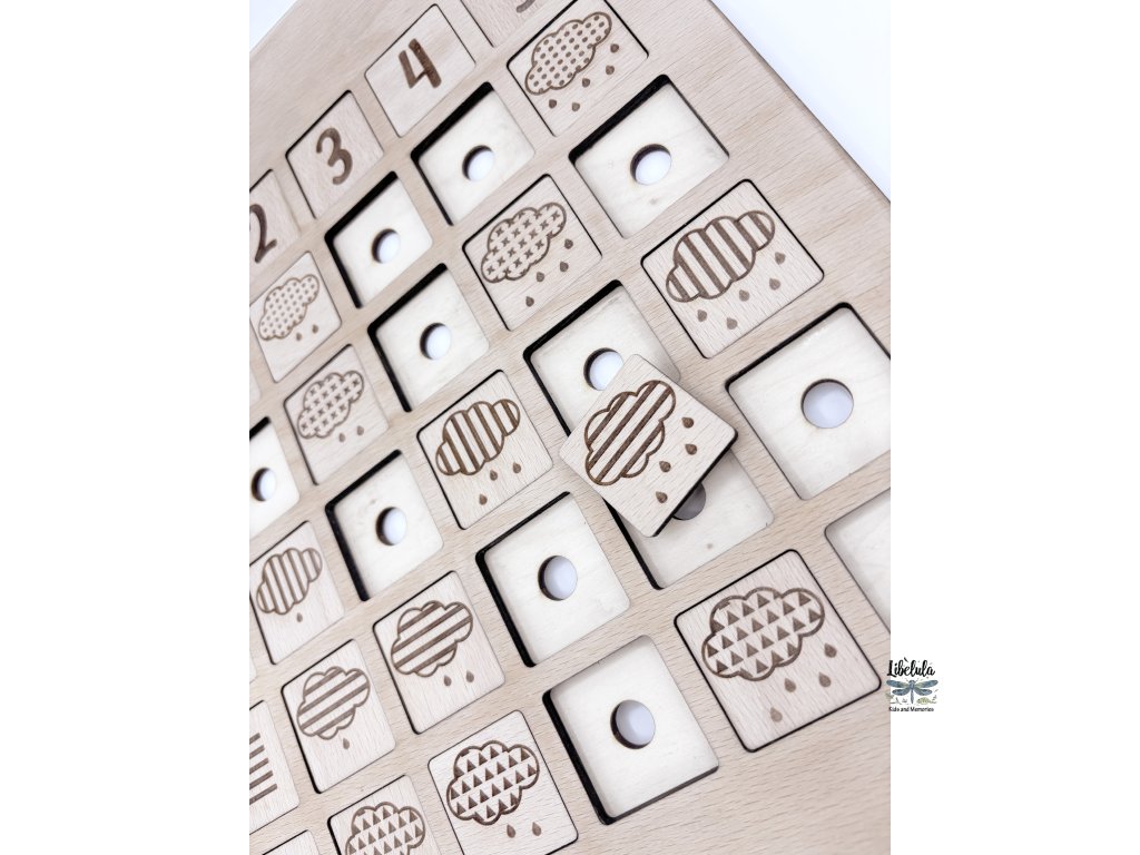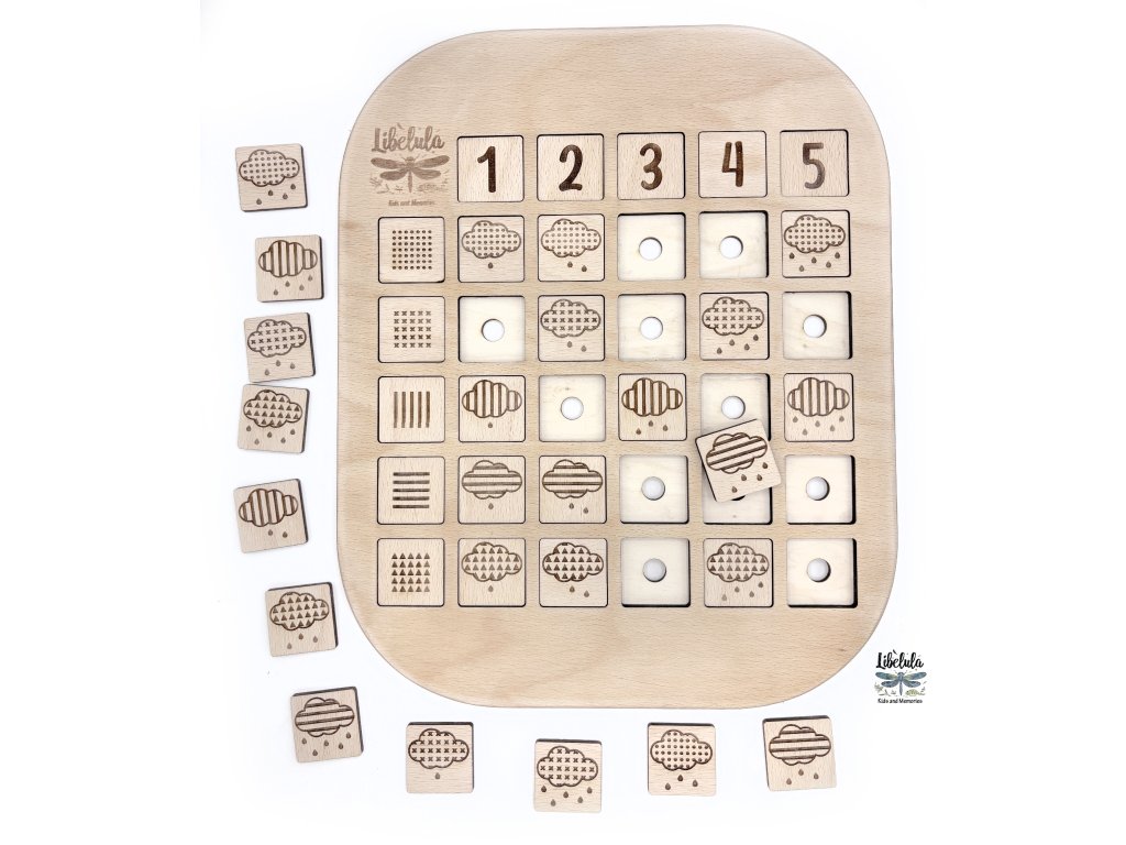 LOGIBOARD – Mraky & Počítanie 1‑5 je výnimočná drevená doska s 35 políčkami, kde sa čísla 1–5 spájajú s piatimi rôznymi typmi mrakov. Každý obláčik má svoj vzor – bodky, krížiky, čiarky alebo trojuholníky – a počet týchto prvkov presne zodpovedá číslu v hornom riadku.
