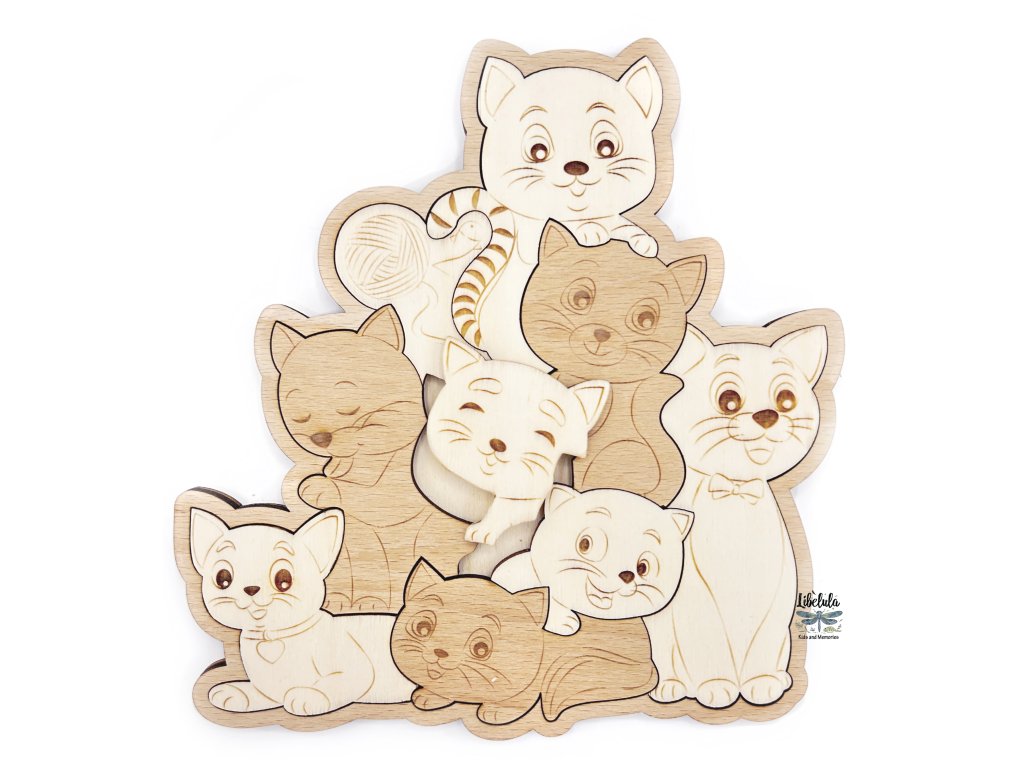 🐱 Drevená skladačka plná rozkošných mačiatok z kolekcie Mysli&Vlož™ rozvíja vizuálnu pamäť, jemnú motoriku a priestorovú predstavivosť. Vieš ich všetky správne uložiť späť?
