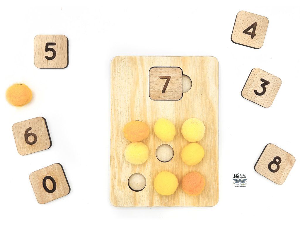 Táto drevená Montessori pomôcka pomáha deťom hravou formou spojiť čísla s množstvom. Deti vkladajú farebné guľôčky do otvorov podľa hodnoty čísla, čím si prirodzene osvojujú základy počítania a vizuálne chápanie čísel.