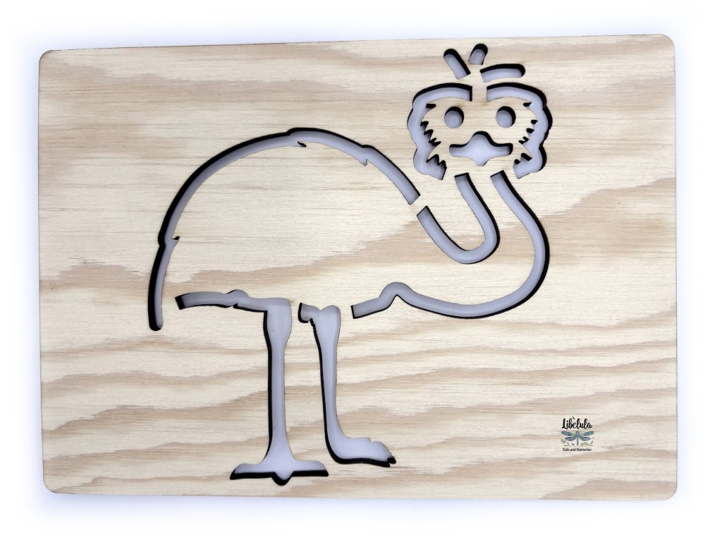 Rýchly bežec s dlhým krkom a veľkými očami! 🐦 Drevená šablóna v tvare emu je ideálna na obťahovanie ceruzkou, fixkou alebo štetcom.