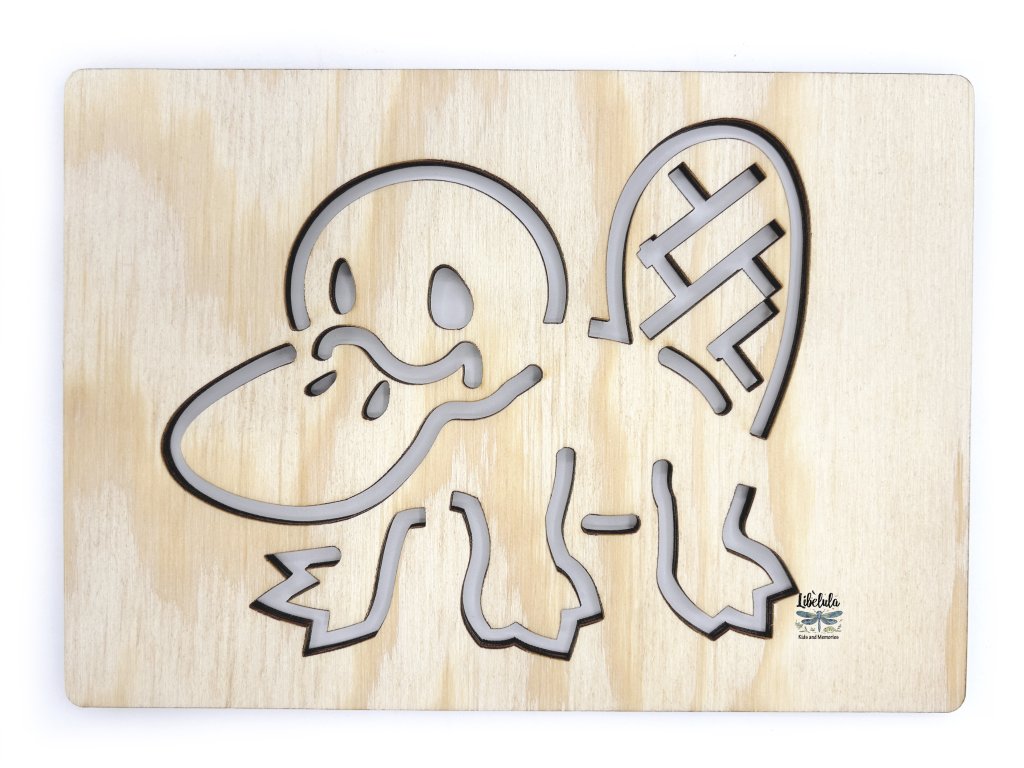 🦆 Drevená šablóna vtákopyska ponúka deťom možnosť spoznať jedno z najneobvyklejších zvierat planéty.
