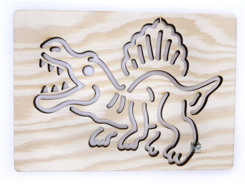 Obrovský lovec s plachtou na chrbte! 🦖 Drevená šablóna v tvare spinosaura je ideálna na obťahovanie ceruzkou, fixkou alebo štetcom.