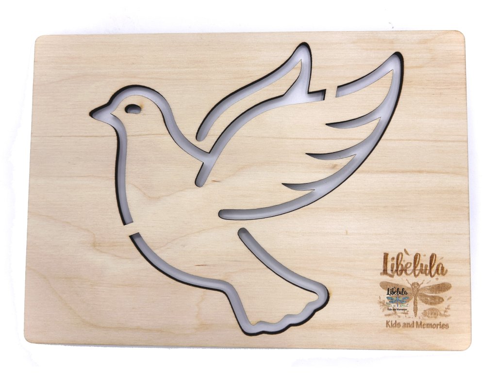 Pokojný letca z dvora! 🕊️ Drevená šablóna v tvare holuba umožňuje deťom ľahko obťahovať obrysy a dotvárať krídla, chvost či slniečko na oblohe.