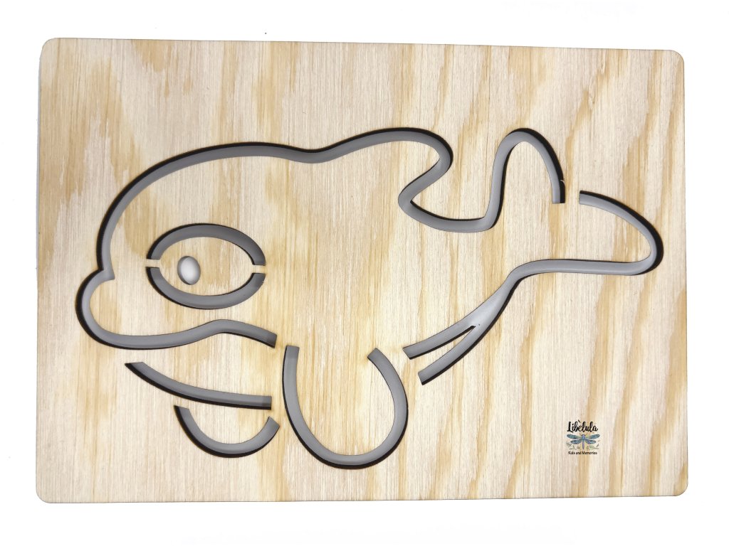 Drevená šablóna v tvare kosatky 🐋 – určená na obťahovanie ceruzkou alebo pastelkou. Dynamický oceánsky motív, ktorý podporuje motoriku a tvorivosť. ✏️✋🌊