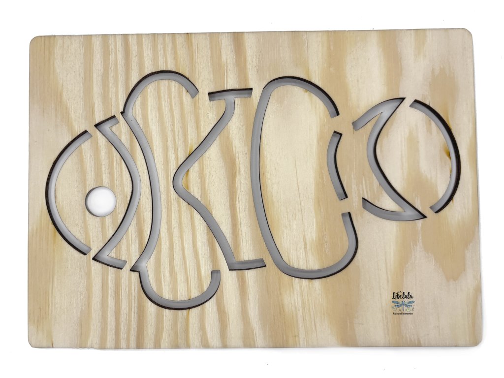 Drevená šablóna v tvare klaun rybičky 🐠 – veselý morský motív na obťahovanie ceruzkou alebo pastelkou. Podporuje jemnú motoriku a hravú fantáziu detí. ✏️✋🌊