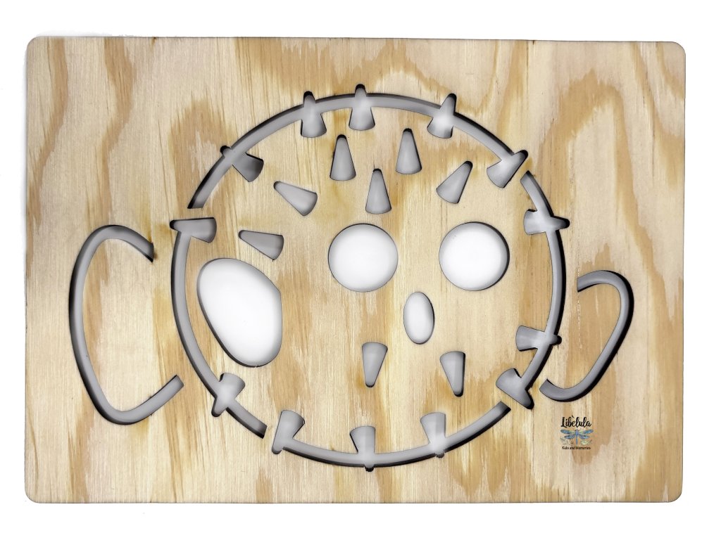Drevená šablóna v tvare ryby fugu 🐡 – zábavný a neobvyklý morský motív na obťahovanie ceruzkou alebo pastelkou. Rozvíja jemnú motoriku a predstavivosť. ✏️✋🌊