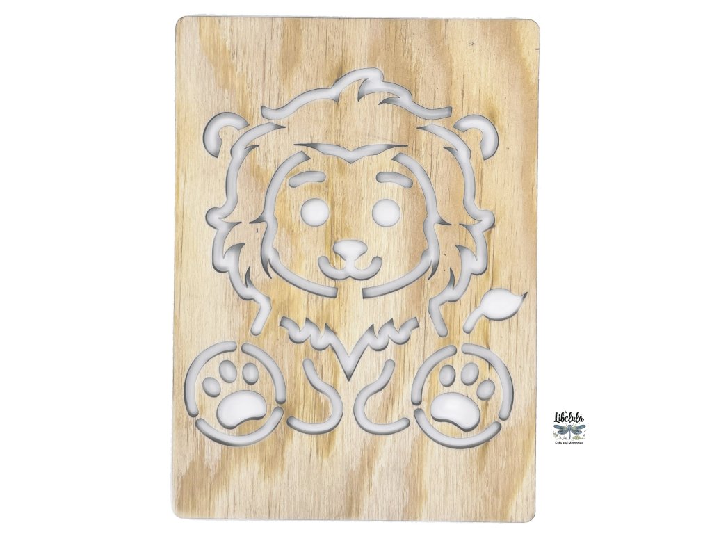 Drevená šablóna v tvare leva 🦁 – vhodná na obťahovanie ceruzkou alebo pastelkou. Podnecuje fantáziu a záujem o majestátne zvieratá z divočiny. ✏️✋🌍