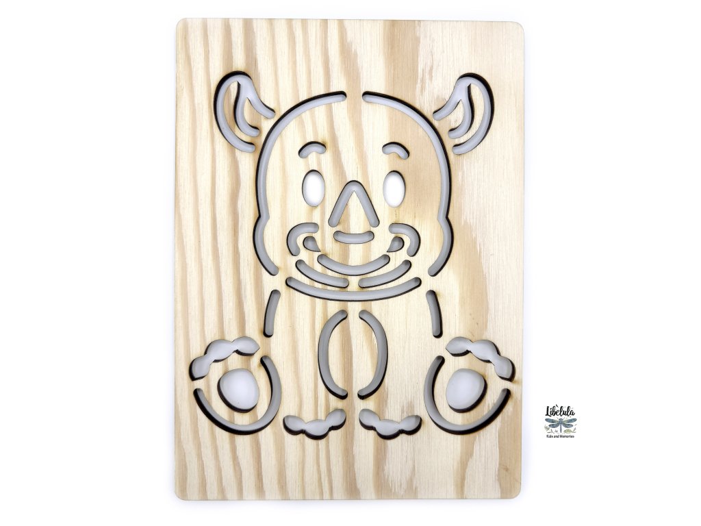 Drevená šablóna v tvare nosorožca 🦏 – určená na obťahovanie ceruzkou alebo pastelkou. Rozvíja jemnú motoriku a predstavivosť pri poznávaní africkej fauny. ✏️✋🌍
