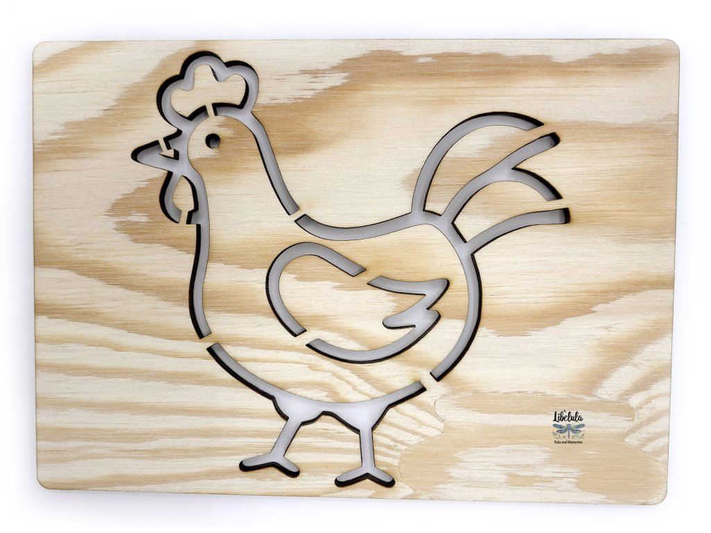 Farebný budíček na farme! 🐓 Drevená šablóna v tvare kohúta je ideálna na obťahovanie ceruzkou alebo štetcom.