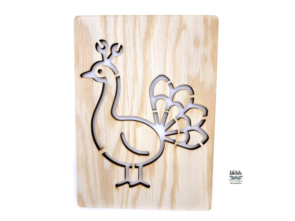 Pestrofarebný tanečník s rozprestretým chvostom! 🦚 Drevená šablóna v tvare páva je ideálna na obťahovanie ceruzkou, fixkou alebo štetcom.