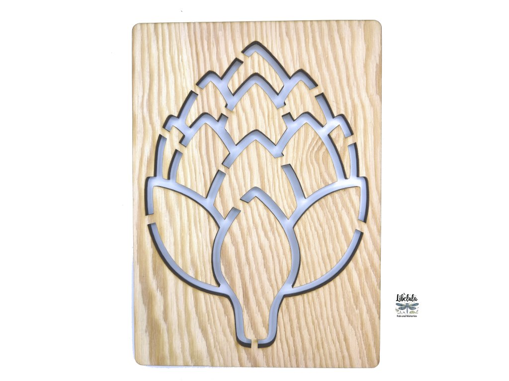 🥬 Drevená šablóna artičoky ponúka vrstvený tvar listov, ktorý podporuje trpezlivé obťahovanie a detailné tieňovanie.