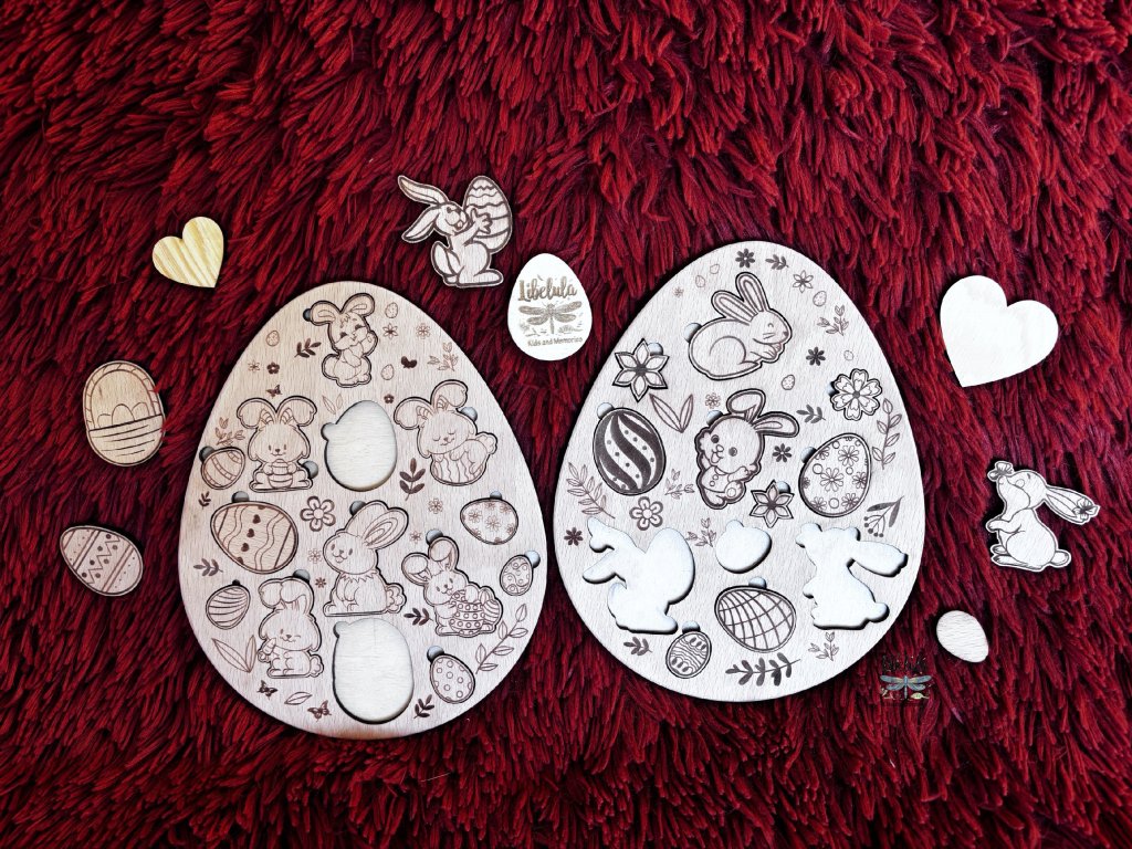Originálna veľkonočná vkladačka vyrobená z kvalitnej dubovej preglejky. Základ tvorí doska v tvare vajíčka s jemne gravírovanými ilustráciami zajačikov, vajíčok, kvetov a ďalších jarných motívov.
